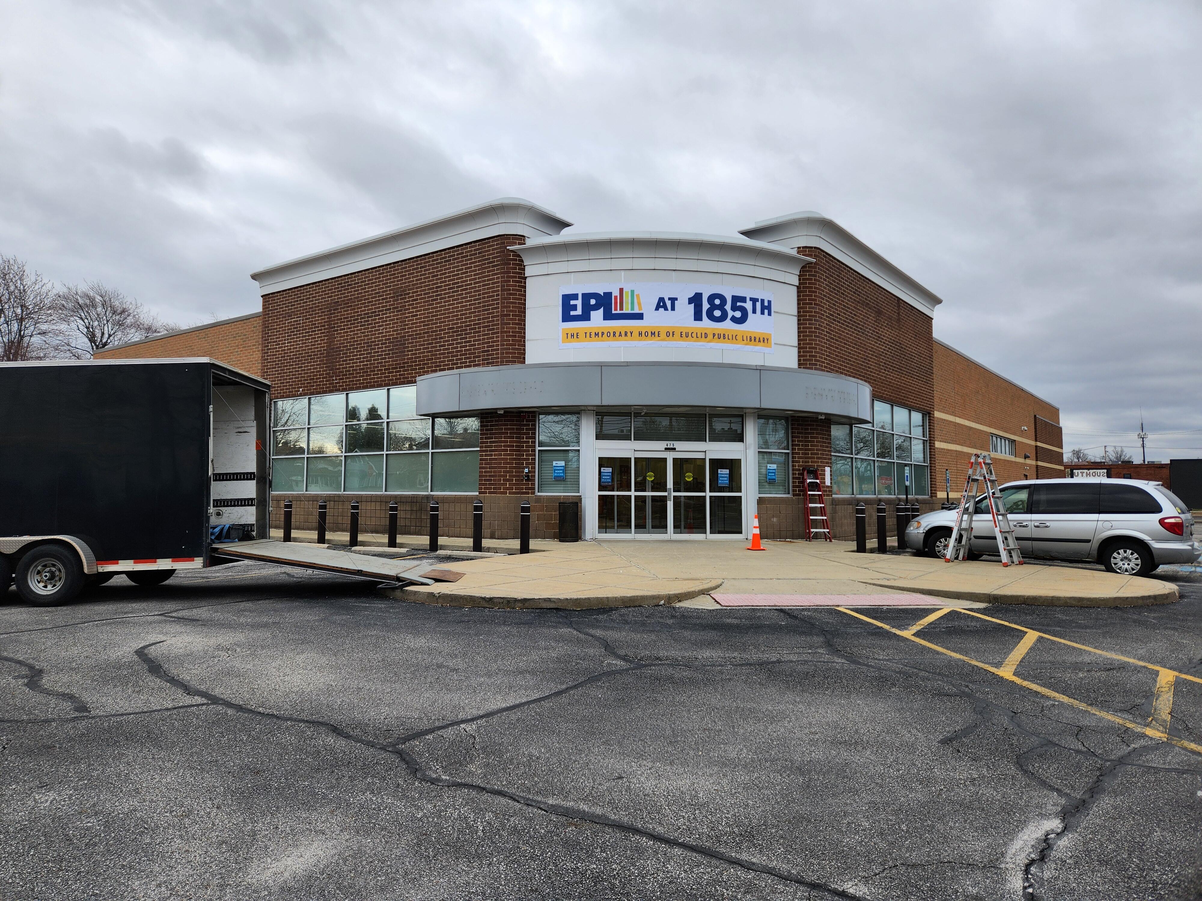The Main Library at East 222nd Street is officially closed! Contractors have installed a gate around the property as renovation work begins. Banners have also been placed to help inform the public. Pictured are Safety Manager Ben Fagan and Maintenance Supervisor David Fasula.